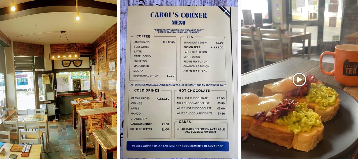 Welcome to Carols Corner, a cozy café located in the heart of Saltash, where delightful meals and great coffee meet casual dining. Enjoy a diverse menu perfect for breakfast, brunch, or lunch, featuring healthy options, small plates, and a variety of vegan and vegetarian choices. Indulge in our sweet desserts and relax with a selection of great teas and wines. With amenities like kerbside pickup and delivery, we cater to both dine-in and takeout needs. Our family-friendly atmosphere and dedicated service ensure a welcoming experience for everyone, whether you’re stopping by solo or with loved ones. Join us at Carols Corner for a memorable dining experience!Customers rave about the exceptional coffee at Carols Corner. The rich flavors and expertly crafted drinks set a high bar for café standards. The inviting and casual ambiance is also a highlight, making it a favorite gathering place for families, friends, and solo diners alike. Many patrons return specifically for the breakfast offerings, especially the hearty full English, praised for its flavor and generous portions. The café’s friendly staff consistently receive accolades for their attentive service, enhancing the overall dining experience. The tempting selection of desserts makes it hard to resist grabbing something sweet before you leave.